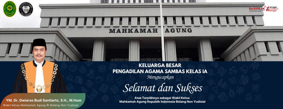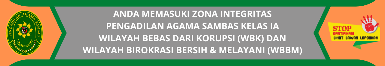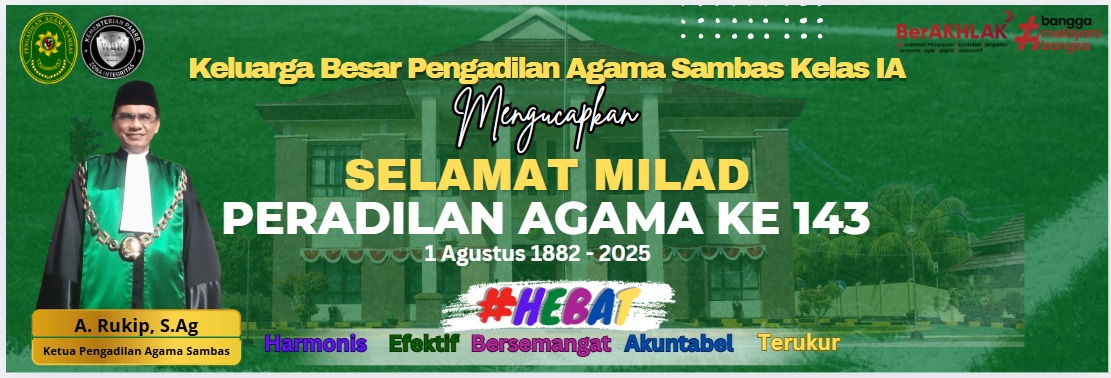 Assalaamualaikum Wr. Wb. Selamat datang di website resmi Pengadilan Agama Sambas Kelas IA. Website ini dibuat sebagai sarana untuk memberikan beragam informasi khususnya yang berkaitan dengan tugas pokok dan fungsi Pengadilan Agama Sambas Kelas IA.