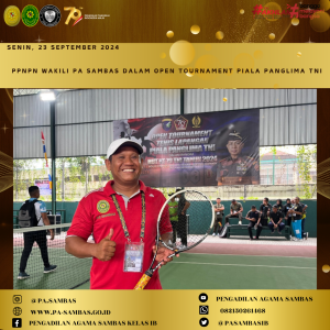 Kodam XII/Tanjungpura akan menggelar Open Tournament Tennis Lapangan Piala Panglima TNI pada 23-30 September 2024. Turnamen ini digelar dalam rangka memperingati Hari UlangTahun ke-79 Tentara Nasional Indonesia tahun 2024.Syauri Rusadi yang dipanggil Santok pada kesehariannya adalah PPNPN PA Sambas mewakili PA Sambas mengikuti kegiatan dengan kategori Prestasi Ganda Putra berpasangan dengan Dedy asal Singkawang.