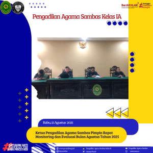 Sambas, Pengadilan Agama SambasĀ menggelar rapat monitoring dan evaluasi (monev) kinerja yang dipimpin langsung oleh Ketua A. Rukip, S. Ag serta didampingi oleh Sekretaris Agus Fitriandari, S. H. I. dan Panitera H. Muhammadiyah, S. Ag. di ruang sidang utama, Rapat ini dihadiri oleh seluruh aparatur dari bagian kesekretariatan dan kepaniteraan, dengan tujuan meninjau kembali monev realisasi kegiatan kegiatan sampai bulan Juli 2025 dan lanjut sampai saat ini.